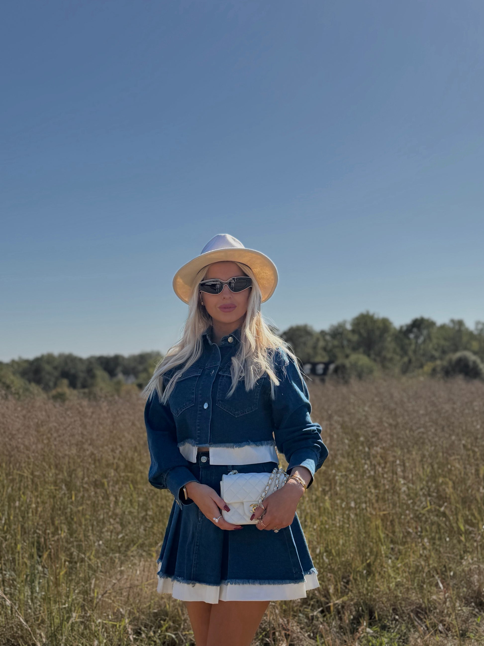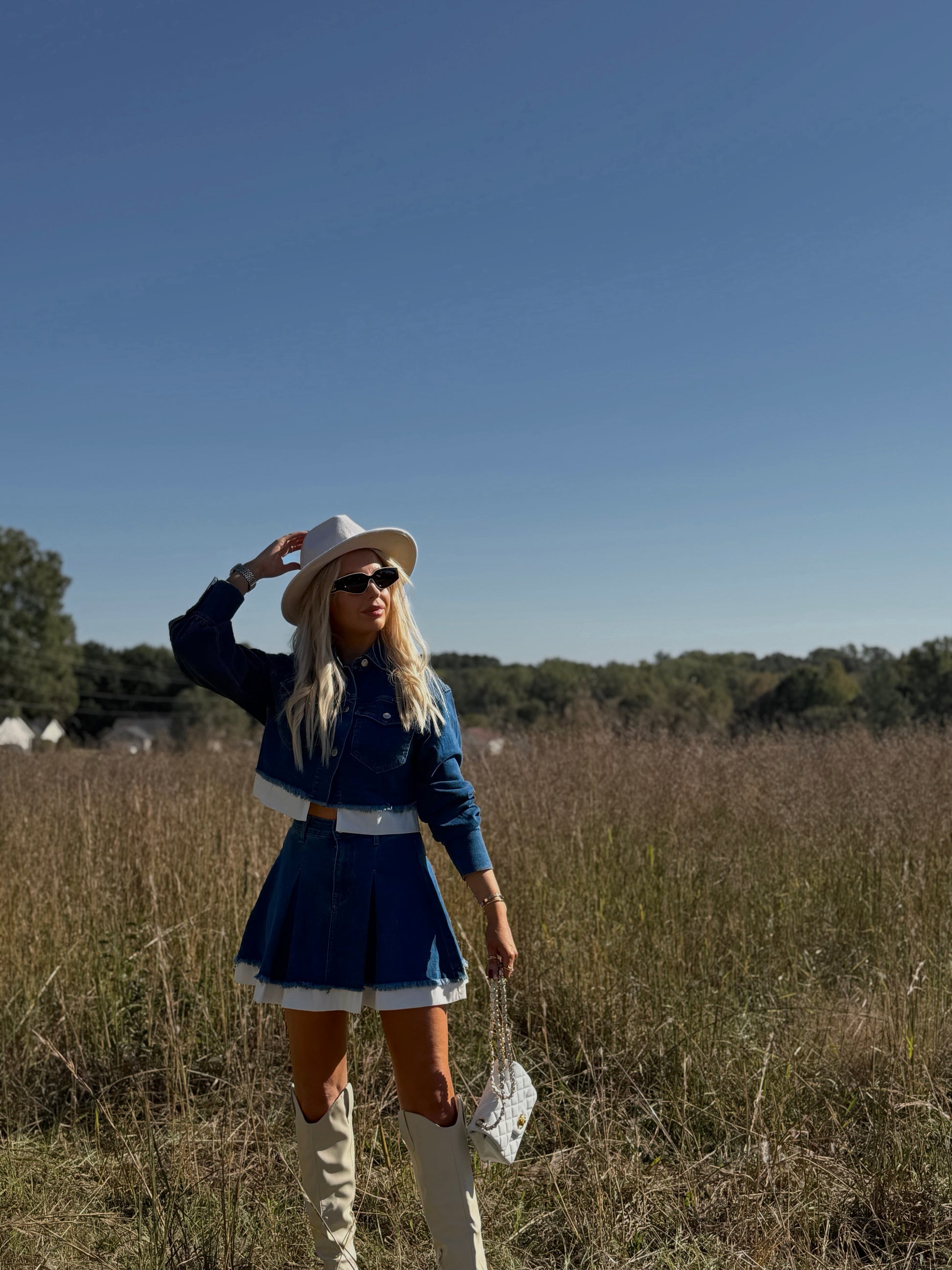Effortlessly chic with a touch of modern Western charm, the Blue Horizon Denim Set redefines casual sophistication. Crafted from rich indigo denim with crisp white contrast trim, this two-piece ensemble features a cropped jacket and high-waisted pleated mini skirt, designed to flatter while maintaining comfort and structure.